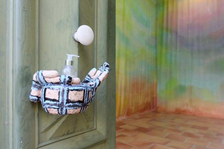 Nadia Agnolet traite les surfaces en laborantine du tannage. Des opérations alchimiques s’occupent des peaux par strates. Alors comme pour l’œuvre Pelade, elle rate une première couche d’engobe, qui s’effritait, pour mieux poser ensuite un émail métallique afin d’obtenir un résultat finalement mat, impossible à atteindre autrement qu’en réussissant ces déconfitures successives. Il faut oser de petites aventures dans sa cuisine picturale. Et ses sculptures s’envisagent souvent par plan. Des peintures sur soie alimentent également ce travail de la superficie, rejouant toujours les réjouissances du paravent, à faire écran.